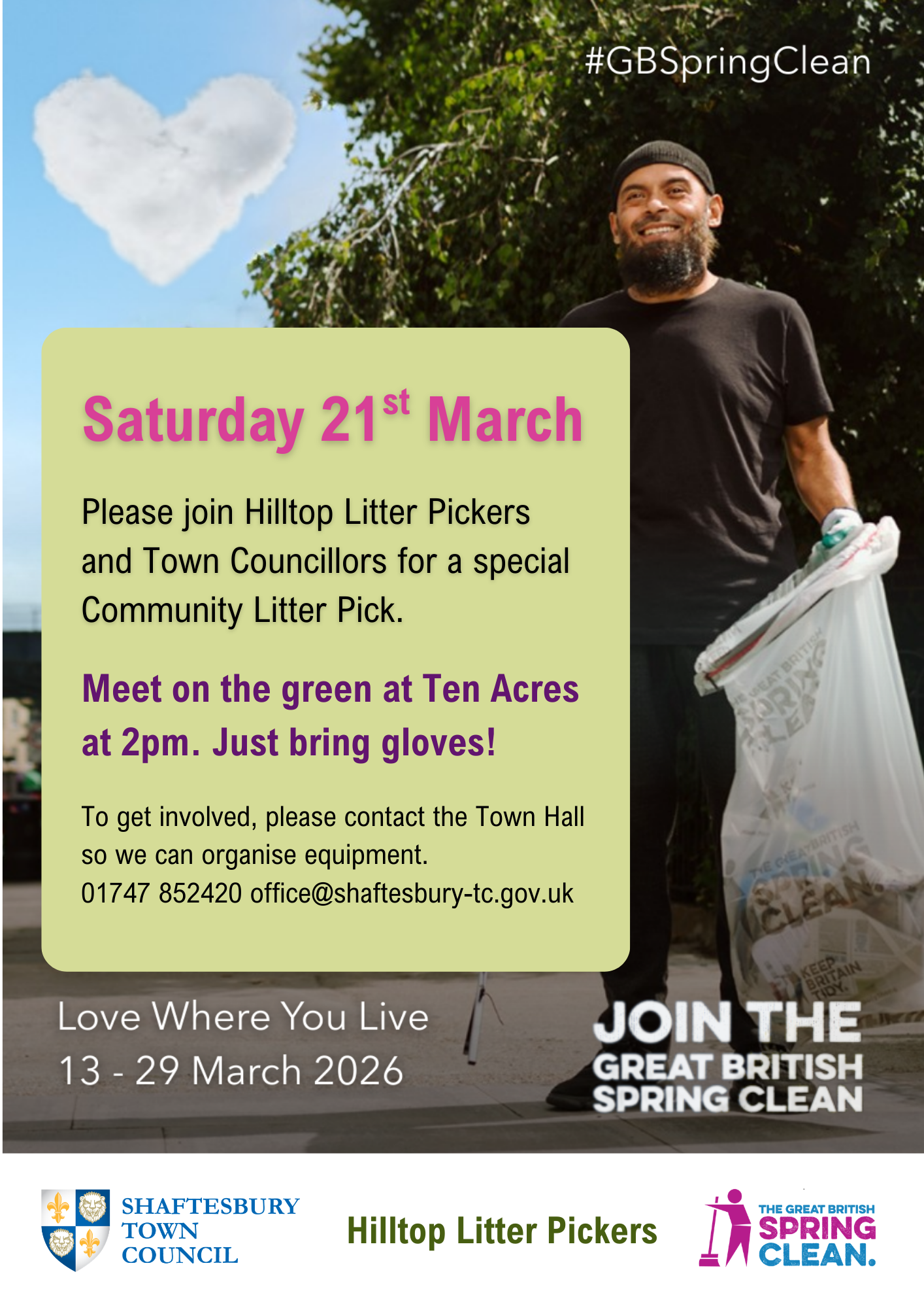 Residents are warmly invited to take part in a Shaftesbury community litter pick on Saturday 21st March, organised by local volunteers Hilltop Litter Pickers together with town councillors as part of the national Great British Spring Clean.